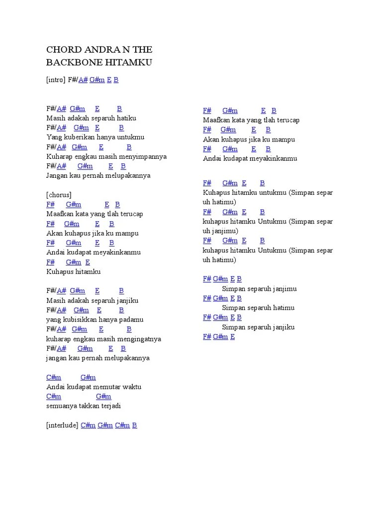 Ku mampu f# g#m e b andai kudapat meyakinkanmu f# g#m e kuhapus hitamku f# g#m e b masih adakah separuh . Situs yang berisi tentang kumpulan chord mudah, kunci gitar dasar dan lirik lagu indonesia maupun mancanegara lengkap. Hitamku by andra and the backbone chord by aburadzi intro f#/a# g#m e b f#/a# g#m e b masi. Berikut lirik dan chord lagu hitamku dari andra & the backbone. Andra and the backbone hitamku kunci gitar andra and the backbone intro :